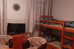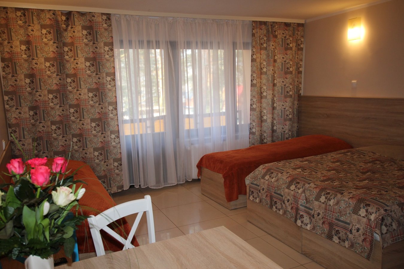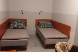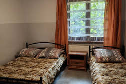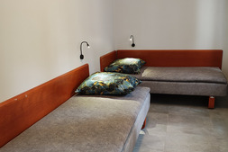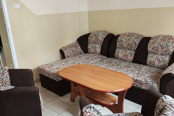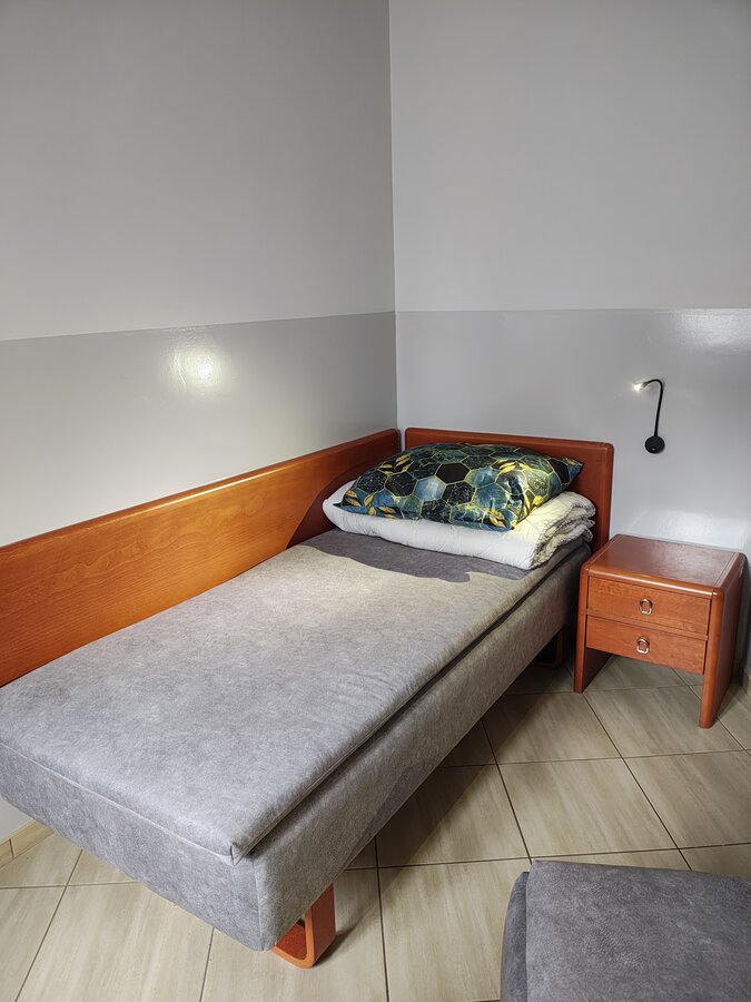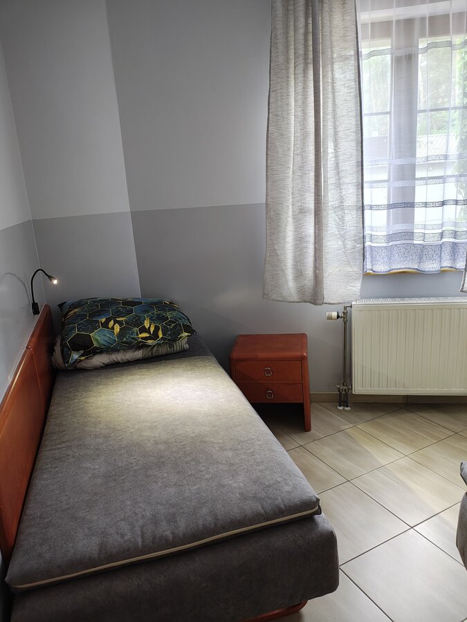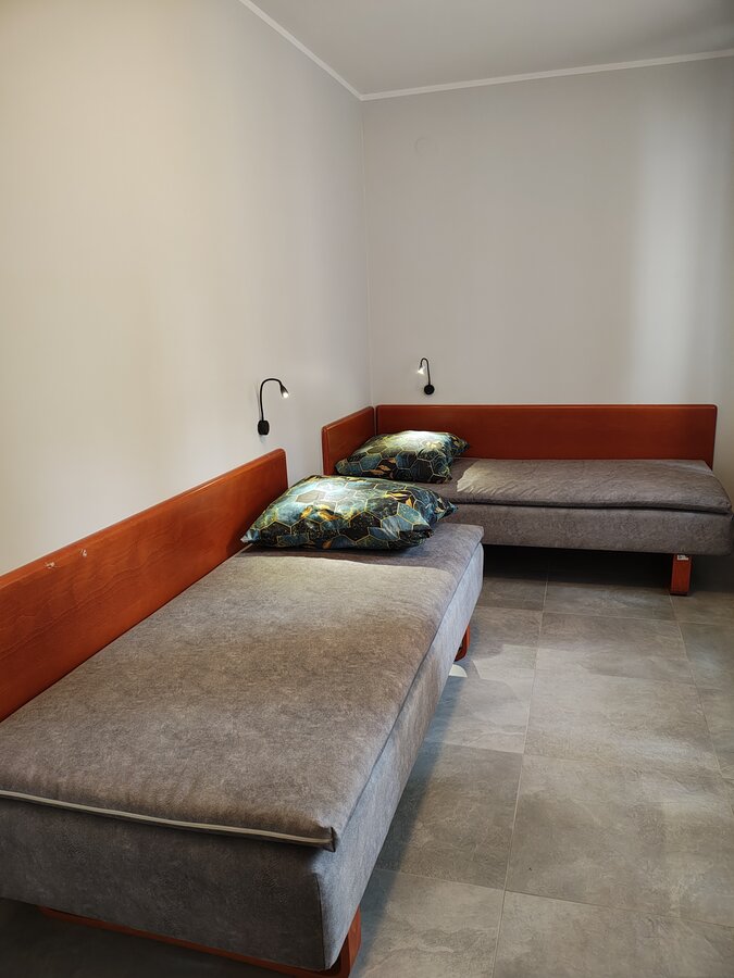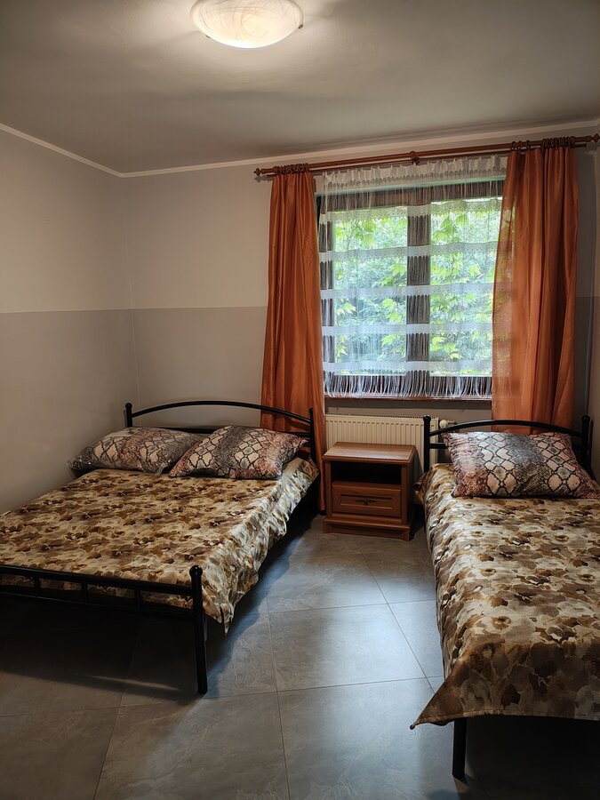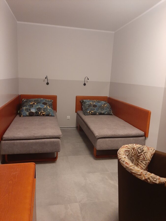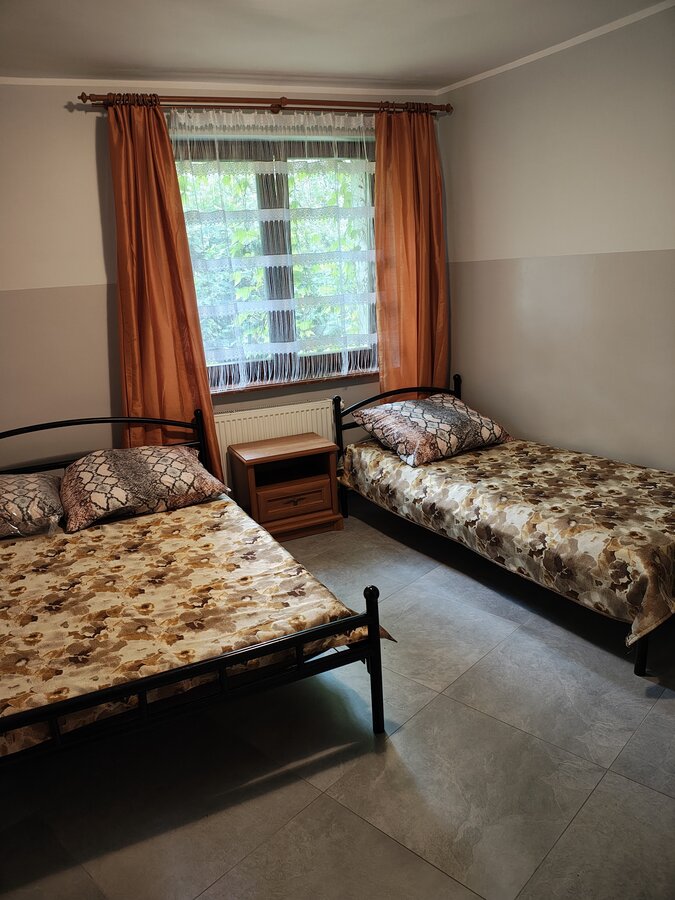 Pokój na I piętrze z dostępem do kuchni. Zestaw wypoczynkowy narożny rozkładany, 2 oddzielne łóżka, łazienka, balkon. Wyposażenie dodatkowe: TV, WI-FI, lodówka, czajnik bezprzewodowy, talerze, sztućce.