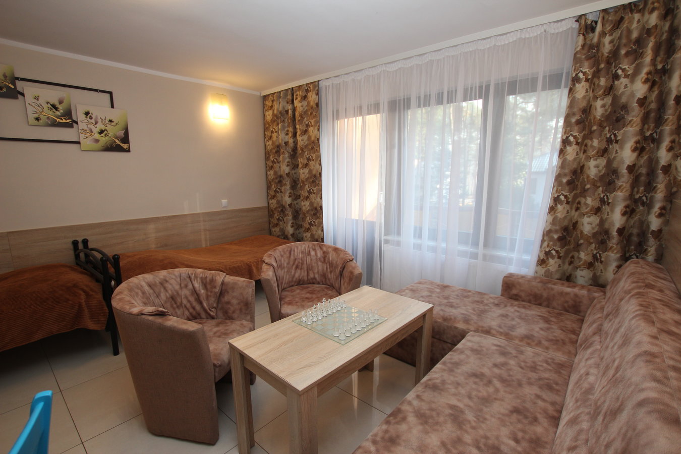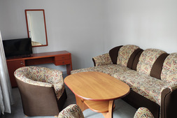 Pokój na I piętrze. Zestaw wypoczynkowy narożny rozkładany, 2 oddzielne łóżka, łazienka, dostęp do kuchni, balkon.