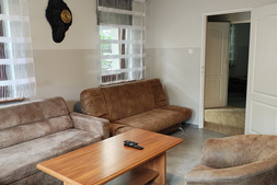 Apartament nr 24 położony jest między budynkiem A i B. Niezależny segment mieszkalny z dwoma pokojami, kuchnią i łazienką. Pokój dzienny: zestaw wypoczynkowy narożny rozkładany, wersalka rozkładana. Sypialnia: łóżko małżeńskie + łóżko pojedyncze.